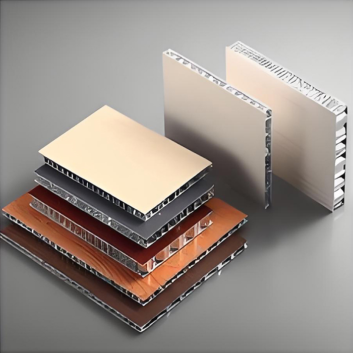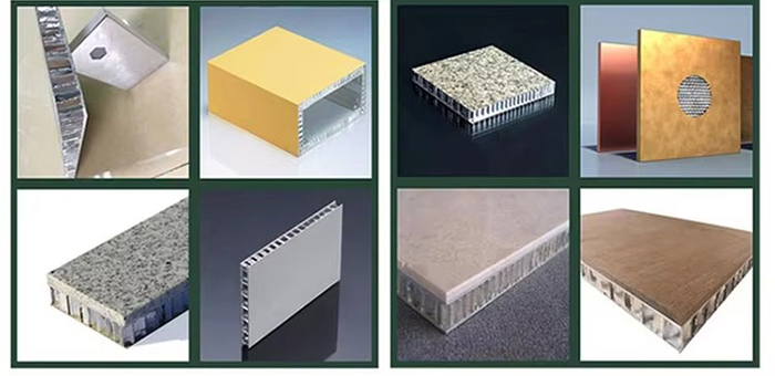Алюминиевая сотовая стеновая панель представляет собой сэндвич-конструкцию, состоящую из двух слоев алюминия и сотового заполнителя. Панель в основном изготовлена из высококачественной алюминиевой пластины из сплава 3003H24 или алюминиевой пластины из сплава с высоким содержанием марганца 5052AH14 в качестве основного материала, с толщиной панели 0,8 ~ 1,5 мм и толщиной нижней пластины 0,6 ~ 1,0 мм. Сотовый сердечник изготовлен из очень тонкой алюминиевой фольги 3003 толщиной 0,04–0,06 мм и длиной стороны 5–6 мм. Он имеет шестиугольную сотовую структуру с отверстиями, соединенными друг с другом. Весь процесс обработки осуществляется на современном заводе с использованием технологии горячего прессования.