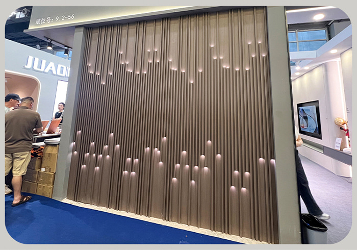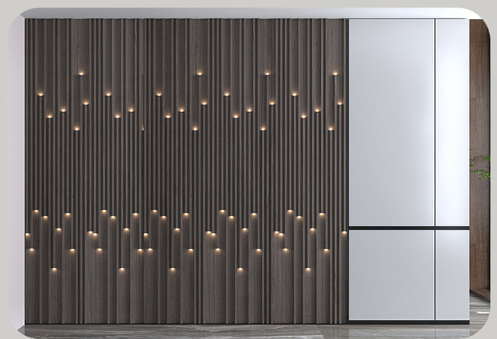 Светящиеся решетчатые стеновые панели – это инновационный продукт, сочетающий в себе современные технологии и декоративную эстетику. Они используют экологически чистые материалы, такие как ДПК, и достигают световых эффектов, прорезая или встраивая оптические волокна на поверхность панелей. Этот тип стеновых панелей не только обладает хорошими декоративными свойствами, но и обеспечивает мягкое освещение, усиливающее ощущение иерархии и атмосферы пространства. Его поверхность может быть украшена различными цветами древесины или сочетаться с другими материалами для удовлетворения различных дизайнерских потребностей.
